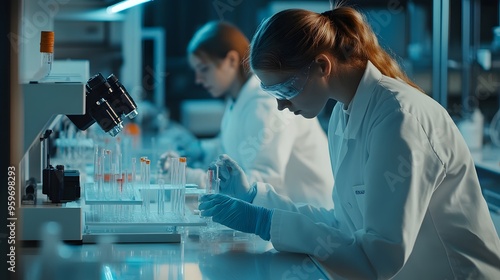 A focused female scientist conducts an experiment in a modern laboratory, emphasizing precision and innovation in research.