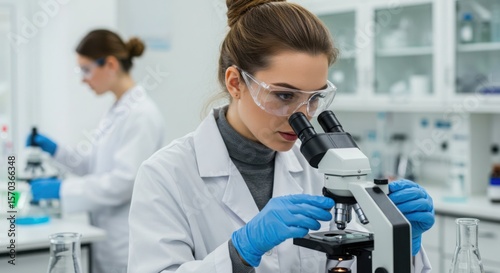 A focused female scientist conducts research using a microscope in a modern laboratory setting