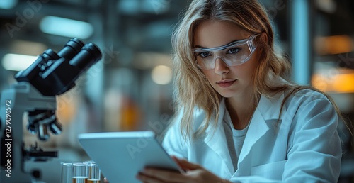 A focused female scientist in a modern laboratory, wearing protective goggles and a lab coat, analyzing data on a tablet while working near a microscope and test tubes under artificial lighting