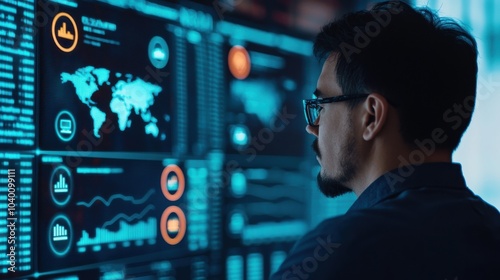 A focused individual analyzes data on digital screens, surrounded by graphs and maps, highlighting insights in a modern workspace.