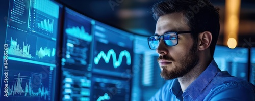 A focused individual analyzes data on multiple screens in a dimly lit environment, showcasing modern technology and analytics.