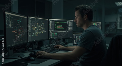 A focused individual analyzing complex data on multiple screens in a dimly lit tech environment