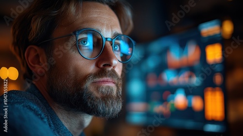 A focused individual analyzing data on a screen in a dimly lit environment.