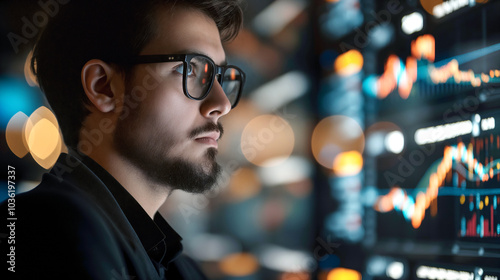 A focused individual studies fluctuating stock market graphs on large screens, surrounded by a high-tech trading room ambiance during nighttime hours - Generative AI