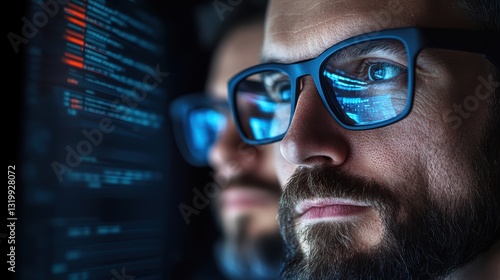 A focused individual with glasses gazes intently at a screen filled with code, representing themes of technology and cybersecurity, Ideal for articles on programming, tech innovations