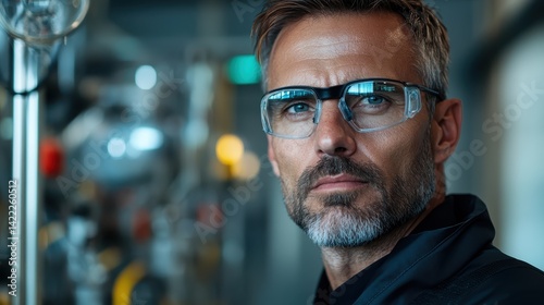 A focused male engineer with glasses stands confidently in an industrial setting, exuding professionalism and expertise within a modern workplace atmosphere.