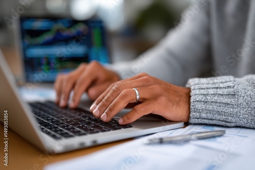 A focused man in a cozy office setting is typing on a laptop, surrounded by financial charts and documents, representing dedication and the essence of modern work culture.