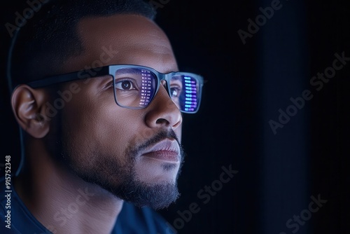 A focused man in glasses gazes intently, illuminated by blue light from a screen in a dark setting, conveying concentration.
