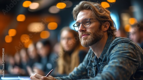 A focused man listens intently to a presentation in a softly lit conference room