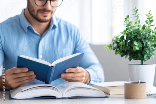 A focused man reading a book at a desk, surrounded by a plant, emphasizing a calm and productive study environment.