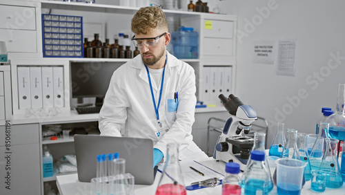 A focused man with beard and safety glasses analyzes data on a laptop in a modern laboratory setting.