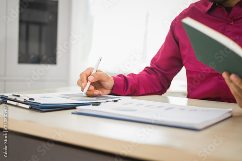 A focused man works diligently in his office, reviewing numerous accounting documents on his desk. His goal is to ensure accuracy and precision, avoiding errors in critical financial data.