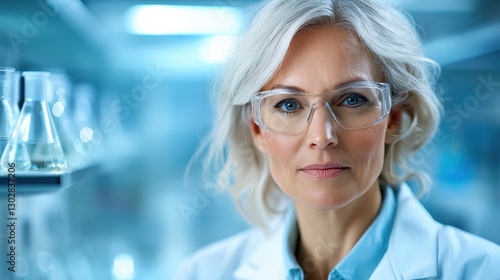 A focused portrait of a mature female scientist in a laboratory, symbolizing wisdom and experience in the field of scientific research and exploration of new frontiers.