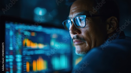 A focused professional analyzes data on a computer screen, illuminated by colorful graphs and statistics in a dimly lit environment.