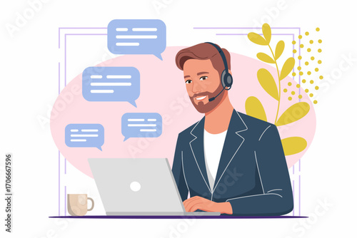 A focused professional man with a headset is working diligently on his laptop, illustrating remote work and modern communication in a vibrant workspace.