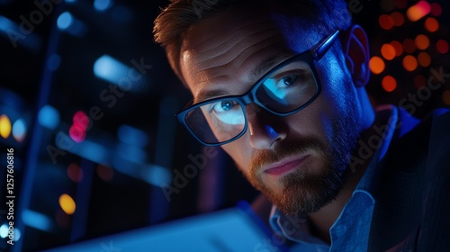 A focused professional working in a high-tech environment, using digital devices to analyze data