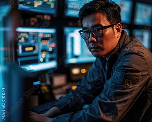 A focused Southeast Asian programmer in casual tech attire, surrounded by computer screens, engrossed in work. Generative AI.