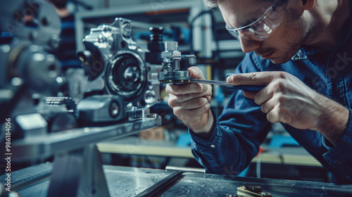 A focused technician is meticulously inspecting mechanical component in workshop, showcasing precision and attention to detail in engineering