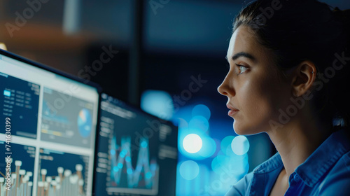 A focused woman dressed in professional attire intently stares at her computer screen, surrounded by the hum of technology and the demands of her indoor job a screenshot captures her determination an