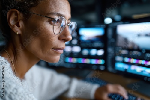 A focused woman is diligently working on visual editing with multiple screens, representing creativity, concentration, and the relentless pursuit of excellence in her craft.