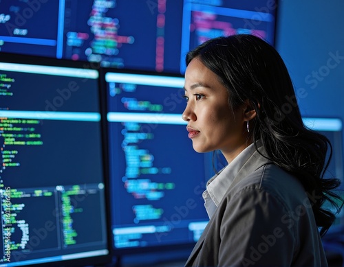 A focused woman with long brown hair, wearing glasses, intently gazes at multiple computer screens displaying colorful graphs and data.