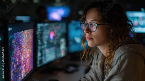 A focused woman works on advanced graphics with multiple computer screens in a dimly lit environment.