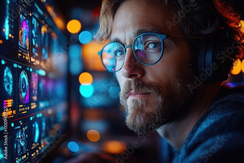 A focused young man with glasses and headphones looks intently at a computer screen displaying data visualizations.