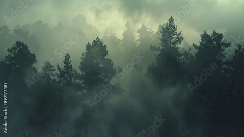 A foggy forest with silhouettes of trees and a mysterious atmosphere.