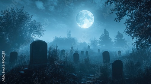 A foggy graveyard with tombstones and a full moon glowing overhead, casting eerie shadows across the scene.
