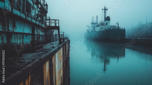 A foggy harbor scene featuring a ship and industrial structures along the water.