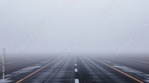A foggy road stretches into the distance, creating an eerie atmosphere with wet pavement and minimal visibility.