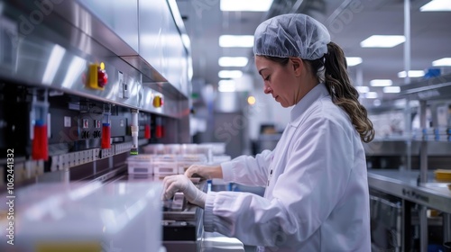 A food processing plant worker attentively monitoring the flow of ingredients through the production machinery