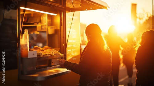 a food truck with open windows serving fresh crepes, warm golden light illuminating the scene, with a crowd gathered around it,
