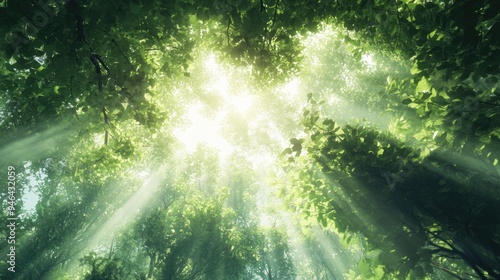 A forest canopy seen from below, with sunlight filtering through the leaves and branches above