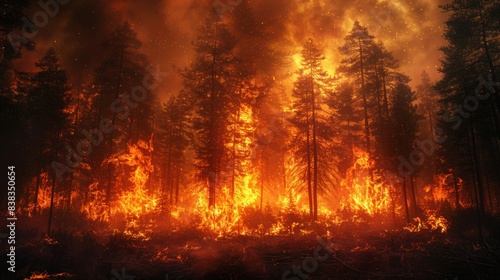 A forest incinerated by fire. Forest fire, forest on fire. Fire Hazard