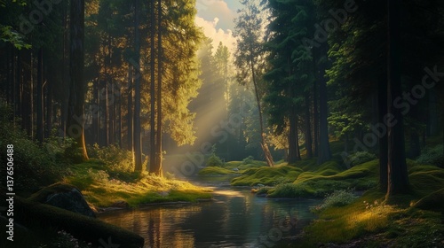 A forest with a river running through it. The sun is shining through the trees, creating a peaceful and serene atmosphere