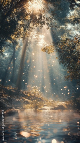 A forest with a stream of water. The water is reflecting the sunlight. There are many trees in the forest