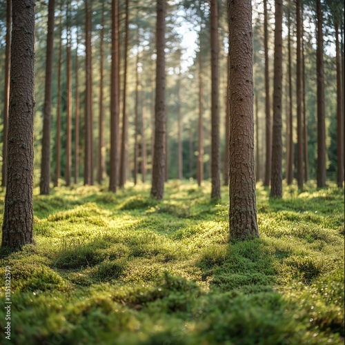 A forest with a tree in the foreground and a tree in the background. The trees are tall and the grass is green