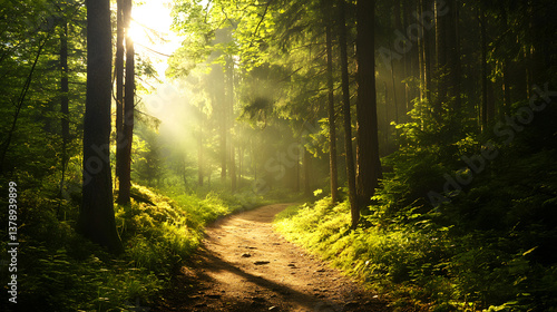 A forested trail through summer mountains, with tall trees lining the way and sunlight filtering through the canopy.
