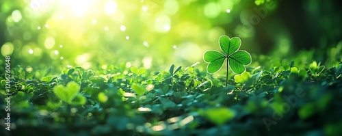 A four-leaf clover in the foreground, surrounded by green grass and leaves. The background is blurred with sunlight filtering through