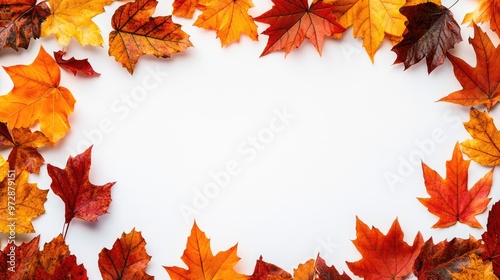 A frame of colorful fall leaves around a blank background, evoking the essence of autumn with ample space for copy