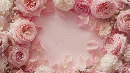 A frame of delicate pink roses and white flowers with petals scattered around, creating a romantic and soft border on a blush background.