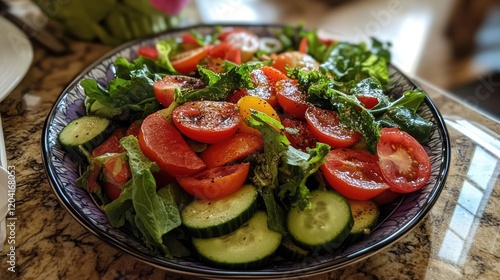 A fresh and colorful vegetable salad with a variety of greens, tomatoes, and cucumbers.