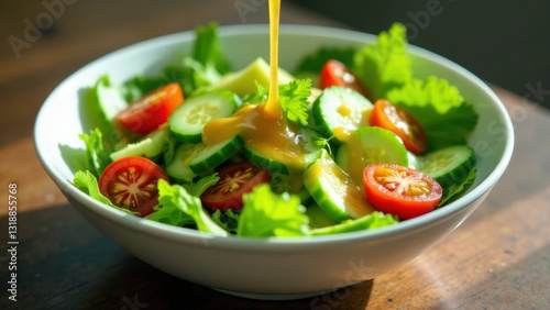 A Fresh and Vibrant Green Salad with Slices of Cucumber and Cherry Tomatoes, Dressed with a Golden Yellow Dressing
