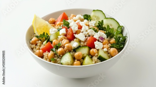 A fresh bowl of quinoa salad with chickpeas, cucumber, and feta cheese. Featuring health and vibrancy