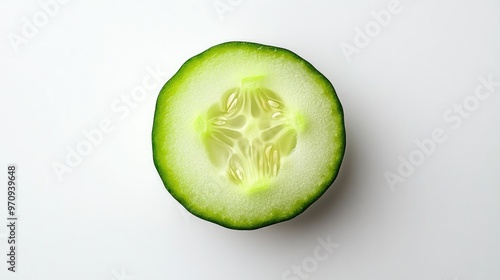 A fresh cucumber slice showing its green skin and crisp interior, placed against a bright white backdrop