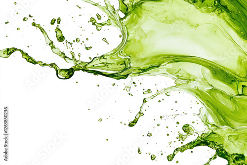 A Fresh green watercolor splash with flowing movement on white canvas background, creating vibrant and dynamic effect