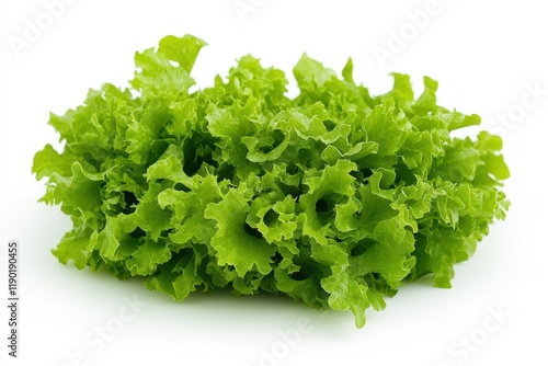 A fresh pile of vibrant green lettuce rests on a clean white surface, showcasing its crisp texture and rich color.