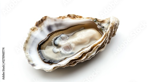 A fresh, raw oyster served naturally in its shell, with smooth textures and a pearly sheen, isolated on a white background.