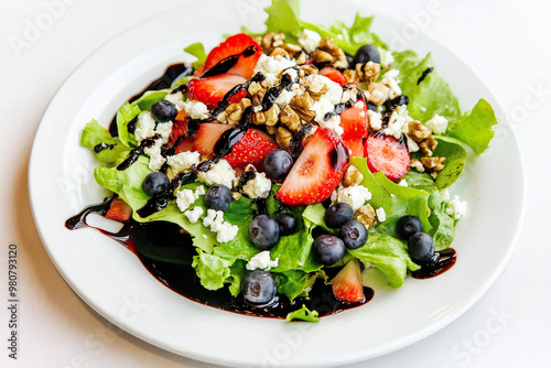 A fresh salad featuring mixed greens, strawberries, blueberries, walnuts, and feta cheese served on a rustic plate,